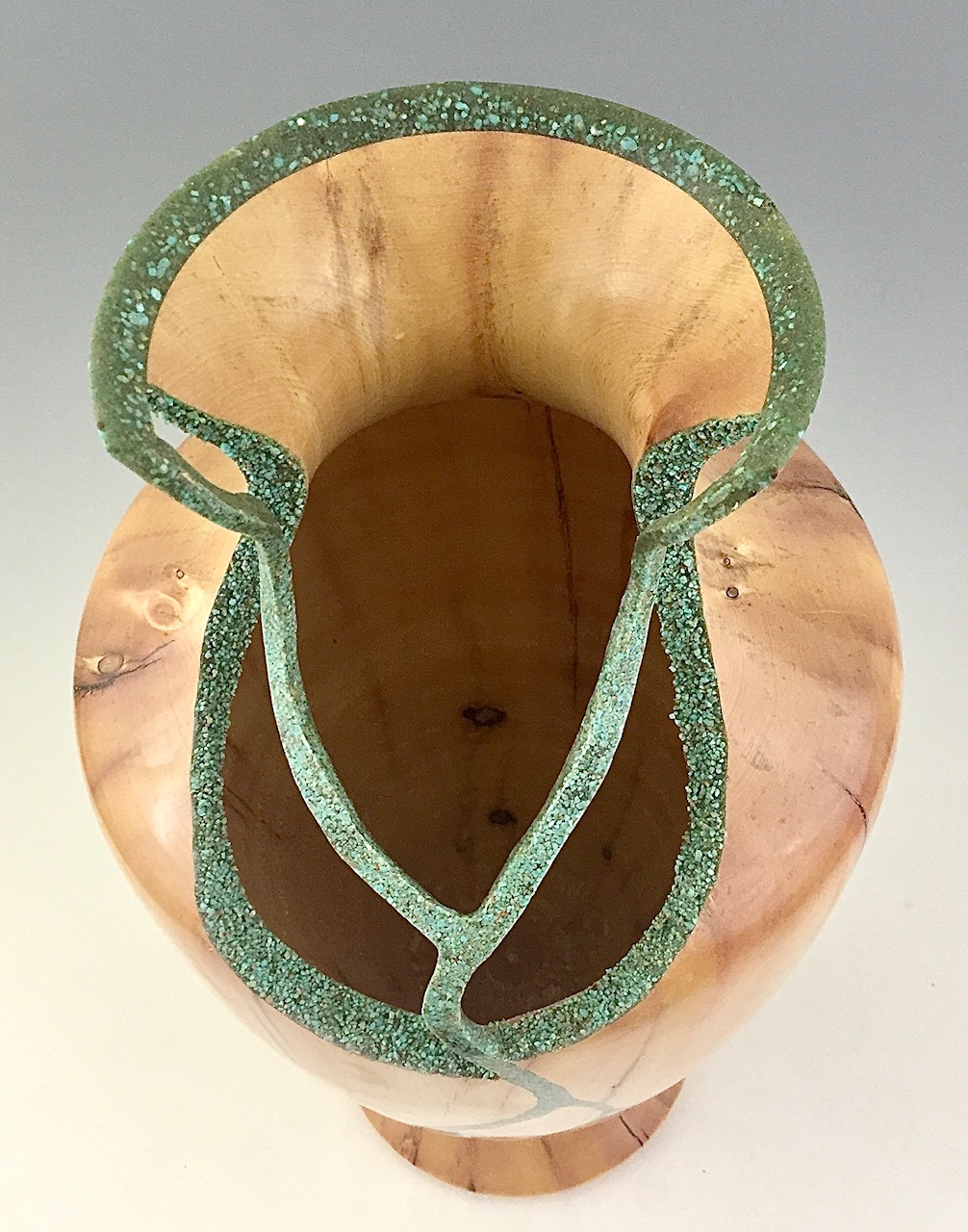 Here are a variety of vases I have created. Some with natural edged bark tops and some with Cripple Creek Turquoise rims. Some have cutouts and some have turquoise inlayed in the cutouts and one was cut in half as a wedding present to show the separation of a union.